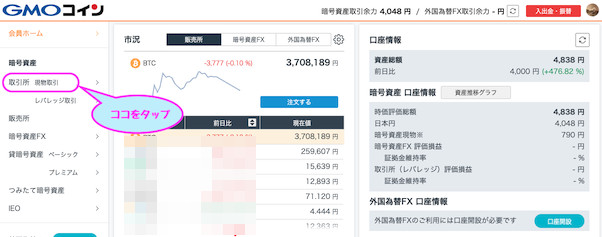 - GMOコインのトップ画面で、取引所「現物取引」をクリックします。