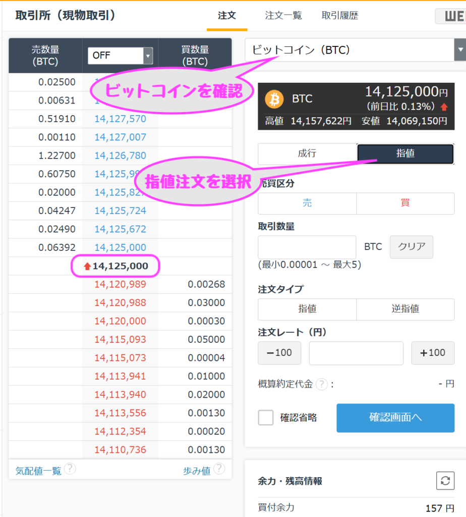 数字が並ぶ画面が表示されました。画面左側が日本円とビットコインの売り板と買い板です。