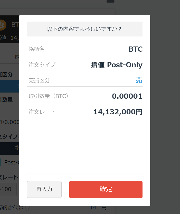 - 「Post-only 」にチェック:メイカー注文にならない取引は成立させない機能