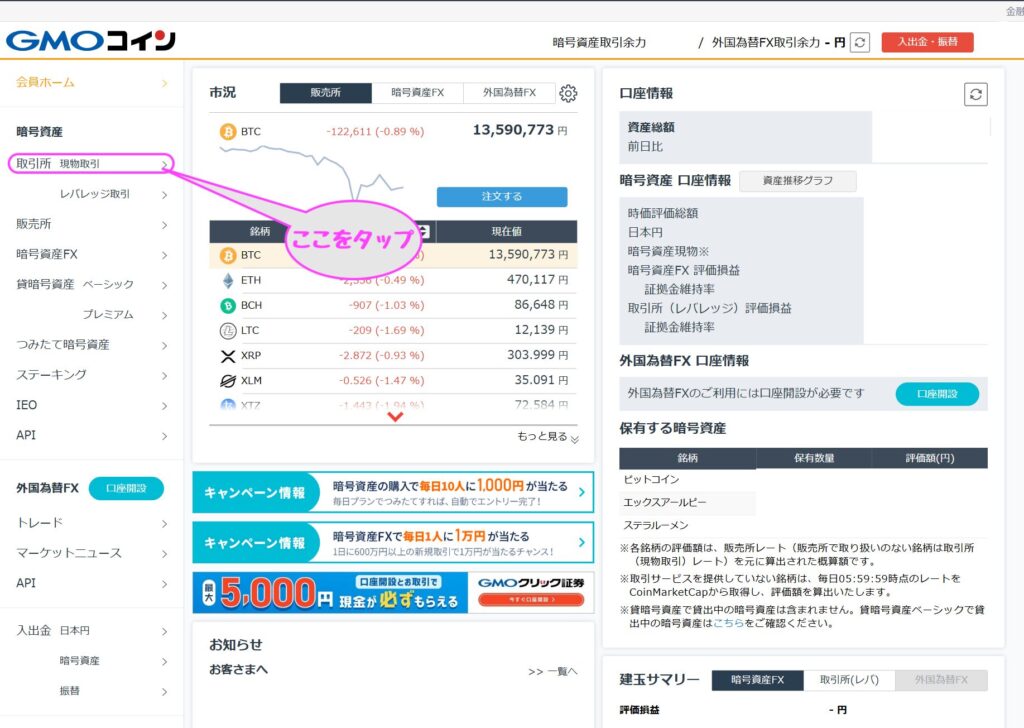 GMOコインのトップ画面で、取引所「現物取引」をタップ